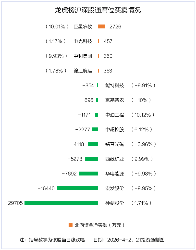 4月2日,北向资金参与龙虎榜中的个股共有13只,合计净卖出6.38亿元。其中沪股通净买入2 股,净卖出3 股,合计净卖出2.22亿元;深股通净买入2 股,净卖出6 股,合计净卖出4.16亿元。