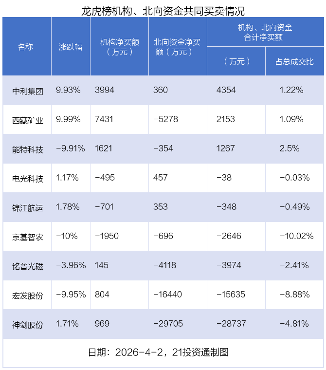 值得注意的是,机构和北向资金共同净买入了中利集团等1股;共同净卖出了京基智农;在电光科技,锦江航运,能特科技,铭普光磁,西藏矿业,宏发股份,神剑股份上出现分歧,机构净卖出电光科技495.18万元,北向资金净买入457.5万元;机构净卖出锦江航运701.33万元,北向资金净买入352.92万元;机构净买入能特科技1620.73万元,北向资金净卖出353.62万元;机构净买入铭普光磁144.6万元,北向资金净卖出4118.33万元;机构净买入西藏矿业7430.58万元,北向资金净卖出5277.88万元;机构净买入宏发股份804.49万元,北向资金净卖出1.64亿元;机构净买入神剑股份968.58万元,北向资金净卖出2.97亿元。