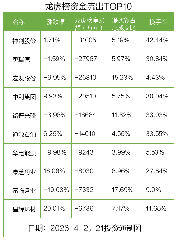 而龙虎榜中资金净流出最多的是神剑股份(002361.SZ),被净卖出为3.1亿元,占总成交金额的5.19%。神剑股份收盘上涨1.71%,换手率为42.44%。