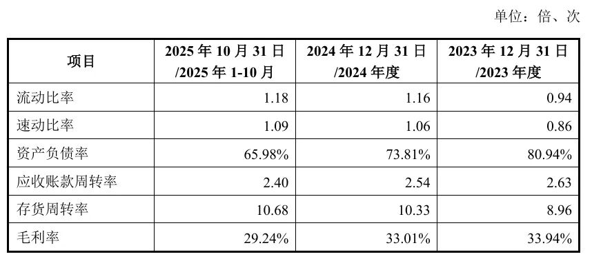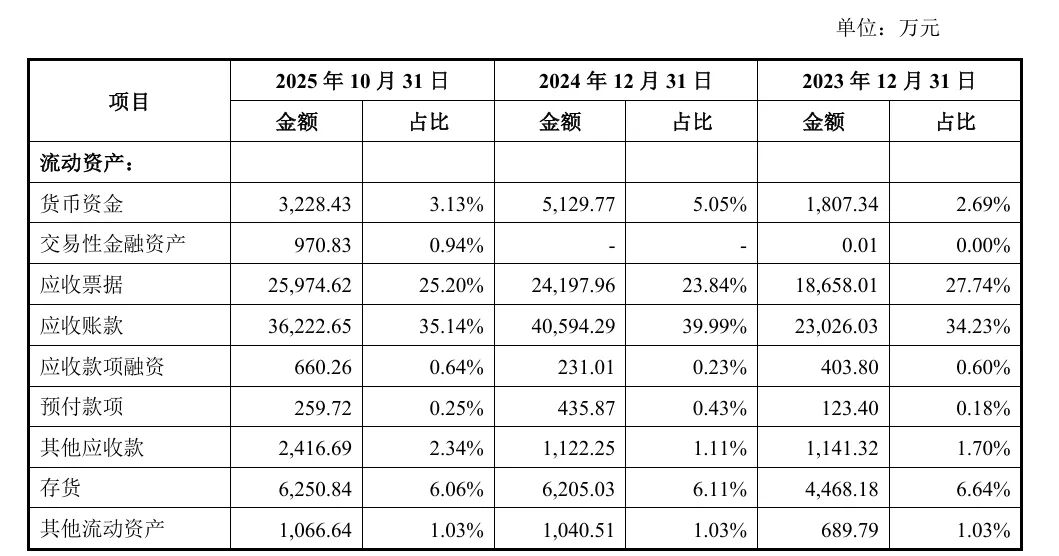 值得注意的是,截至2025年10月,该公司的应收票据和应收账款分别为2.60亿元和3.62亿元,合计占总资产的比例达到60.34%,2024年占比为63.84%,2023年占比为61.97%,这也导致该公司的经营活动产生的现金流量净额在整个报告期内都是负值,分别为-1514.68万元、-1681.64万元和-998.52万元。