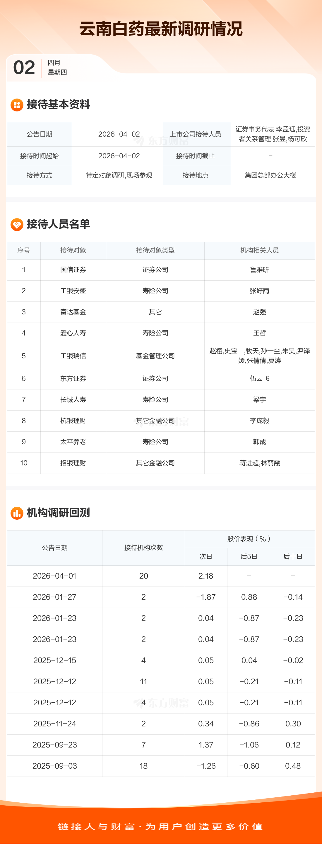 云南白药4月2日公告称,4月2日接待国信证券等10家机构调研。接待人员包括证券事务代表 李孟珏,投资者关系管理 张昱,杨可欣。