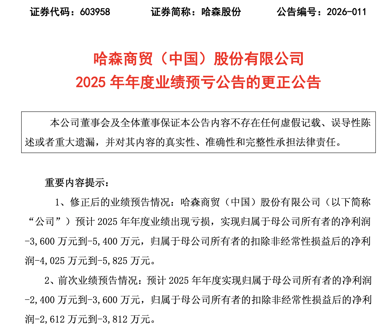 4月2日,哈森股份(603958)发布业绩预告的更正公告,公司预计2025年年度业绩出现亏损,实现归属于母公司所有者的净利润亏损3600万元到亏损5400万元。