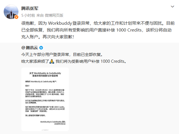 同日,腾讯公司公关总监张军转发该微博表示:“很抱歉,因为Workbuddy登录异常,给大家的工作和计划带来不便与困扰。目前已全部恢复,我们将向所有受影响的用户直接补偿1000 Credits,该积分将自动充入账户。再次向大家致歉!”
