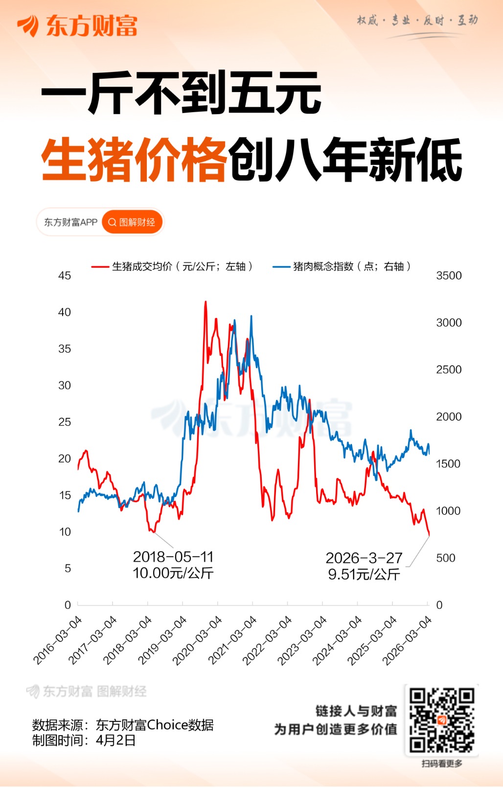 这一举措的现实背景是,全国生猪成交均价连续走低,并于3月27日当周跌至9.51元/公斤,创近八年来新低。东方财富Choice数据显示,全国生猪成交均价曾在2018年5月创出低点10元/公斤,之后价格震荡回升,最高涨至2019年11月的41.50元/公斤。