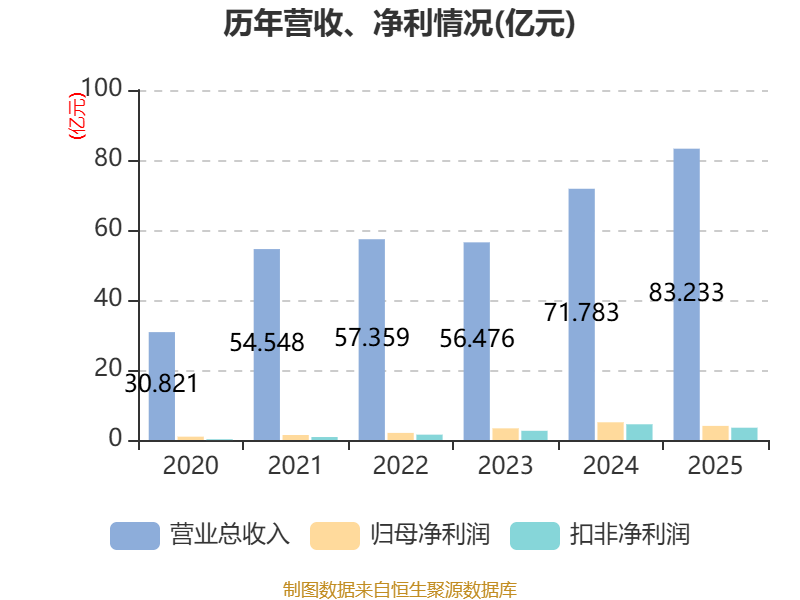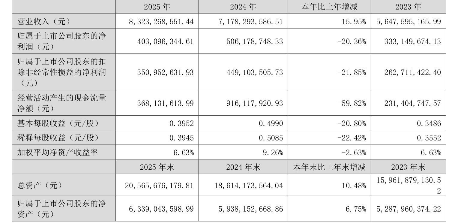 中证智能财讯软控股份(002073)4月3日披露2025年年度报告。2025年,公司实现营业总收入83.23亿元,同比增长15.95%;归母净利润4.03亿元,同比下降20.36%;扣非净利润3.51亿元,同比下降21.85%;经营活动产生的现金流量净额为3.68亿元,同比下降59.82%;报告期内,软控股份基本每股收益为0.3952元,加权平均净资产收益率为6.63%。公司2025年度分配预案为:拟向全体股东每10股派现0.2元(含税)。