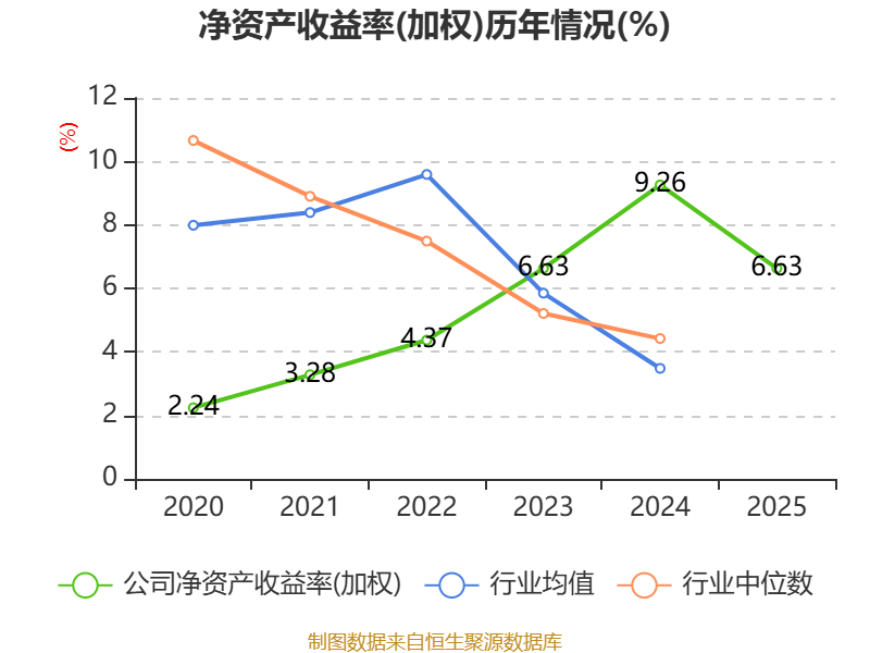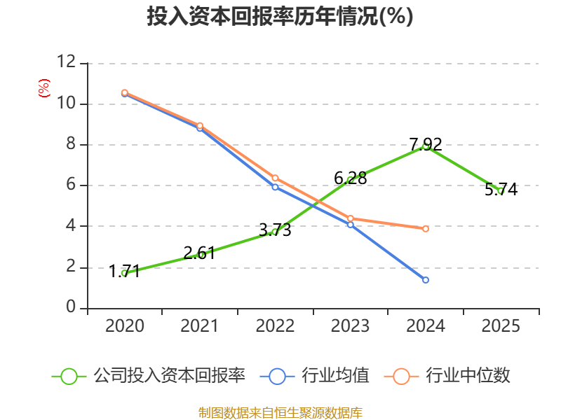 数据显示,2025年公司加权平均净资产收益率为6.63%,较上年同期下降2.63个百分点。公司2025年投入资本回报率为5.74%,较上年同期下降2.18个百分点。