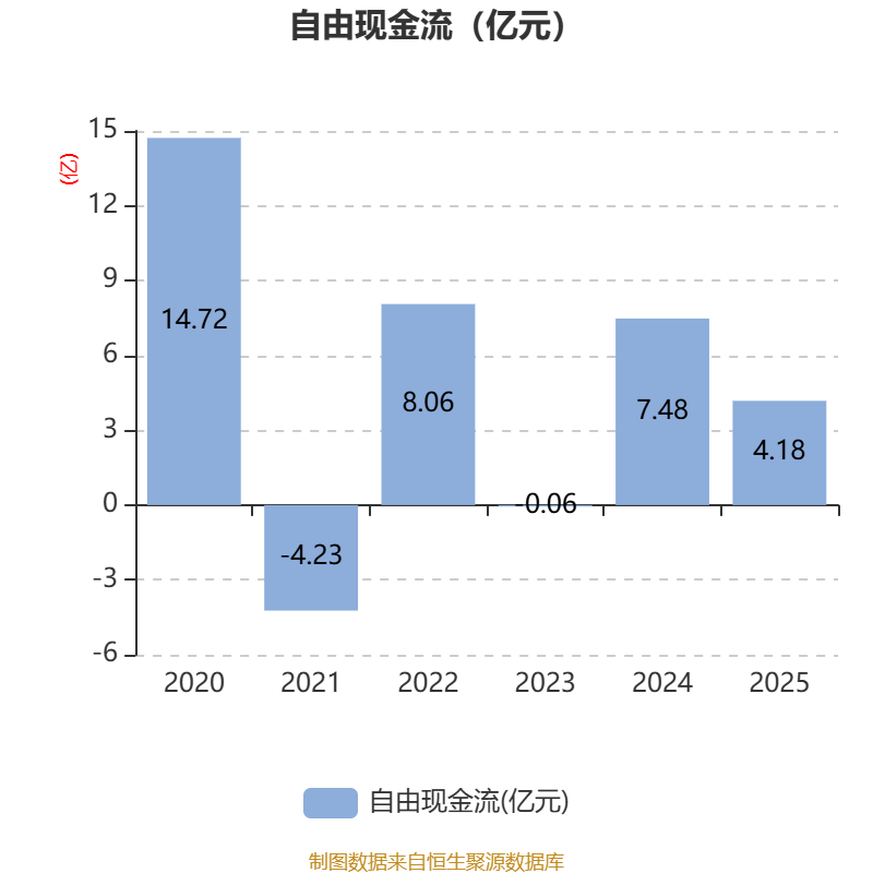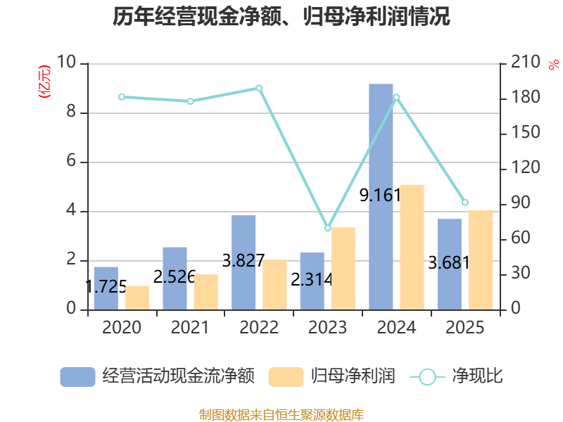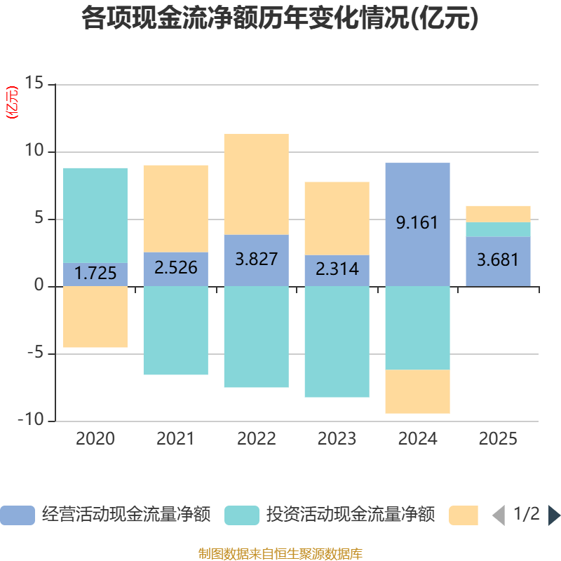 截至2025年,公司经营活动现金流净额为3.68亿元,同比下降59.82%;筹资活动现金流净额1.19亿元,同比增加4.43亿元;投资活动现金流净额1.07亿元,上年同期为-6.22亿元。
