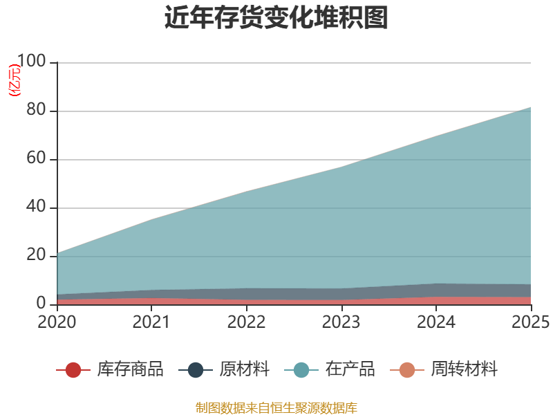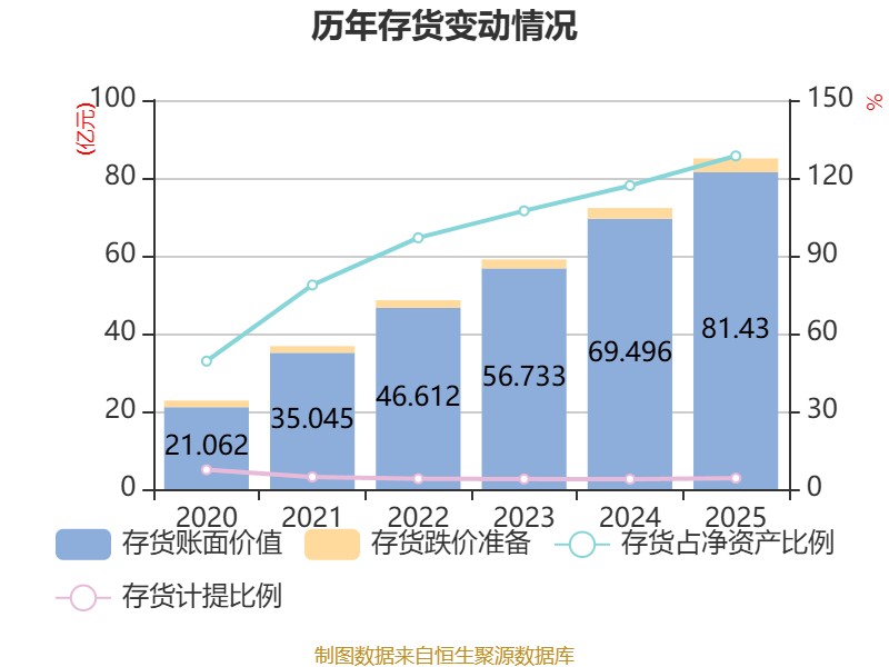 从存货变动来看,截至2025年末,公司存货账面价值为81.43亿元,占净资产的128.46%,较上年末增加11.93亿元。其中,存货跌价准备为3.58亿元,计提比例为4.21%。