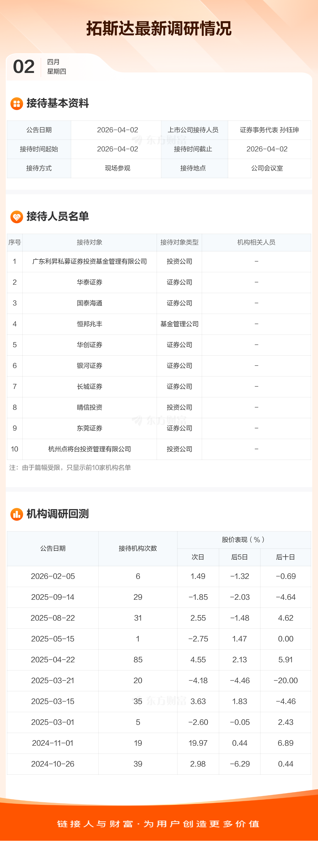 拓斯达4月2日公告称,4月2日接待广东利昇私募证券投资基金管理有限公司等20家机构调研。接待人员包括证券事务代表 孙钰珅。