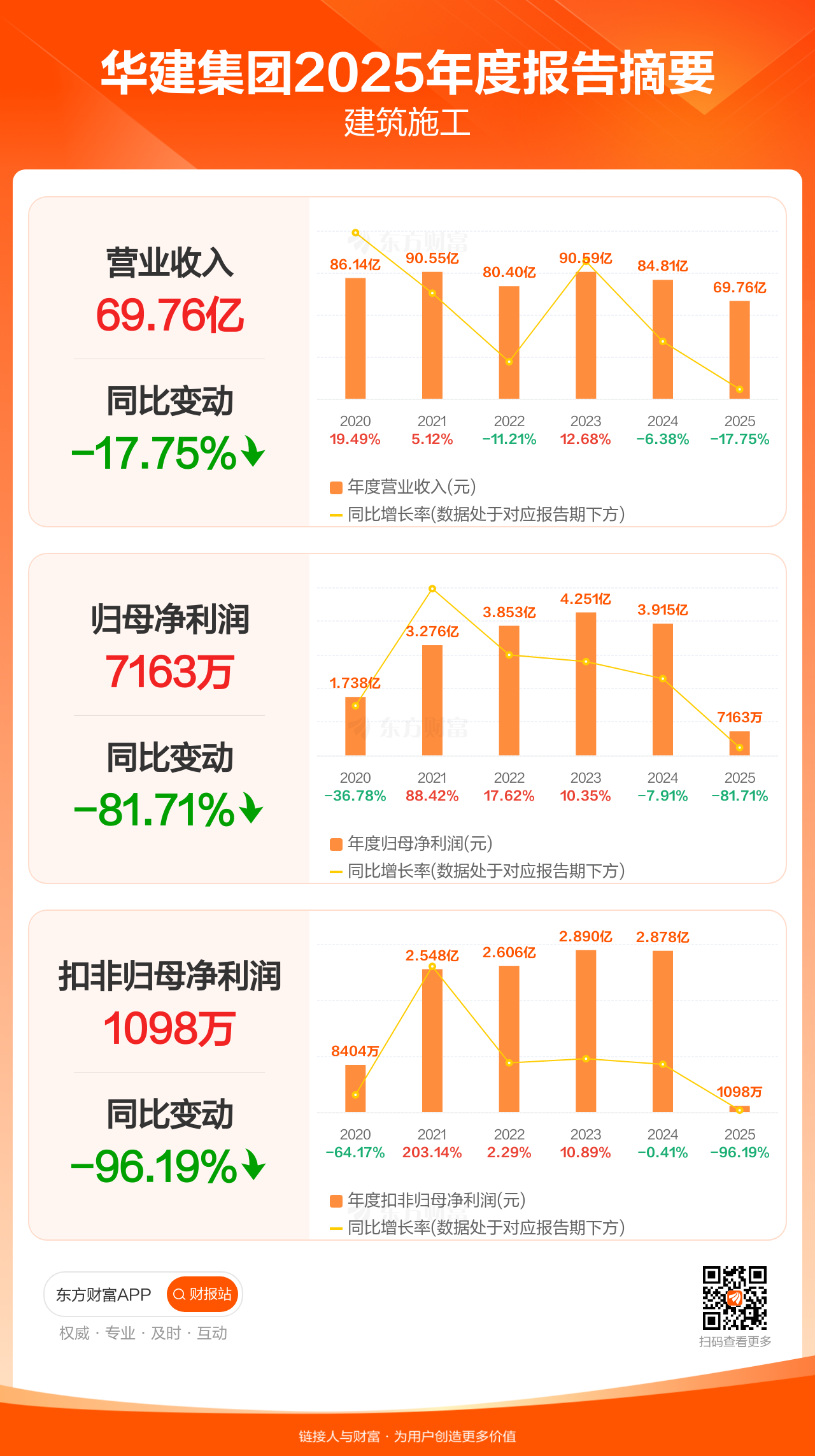 华建集团4月3日发布2025年年报显示,公司全年实现营业收入69.76亿元,同比下滑17.75%;归母净利润7162.73万元,同比下滑81.71%;扣非归母净利润1097.85万元,同比下滑96.19%。
