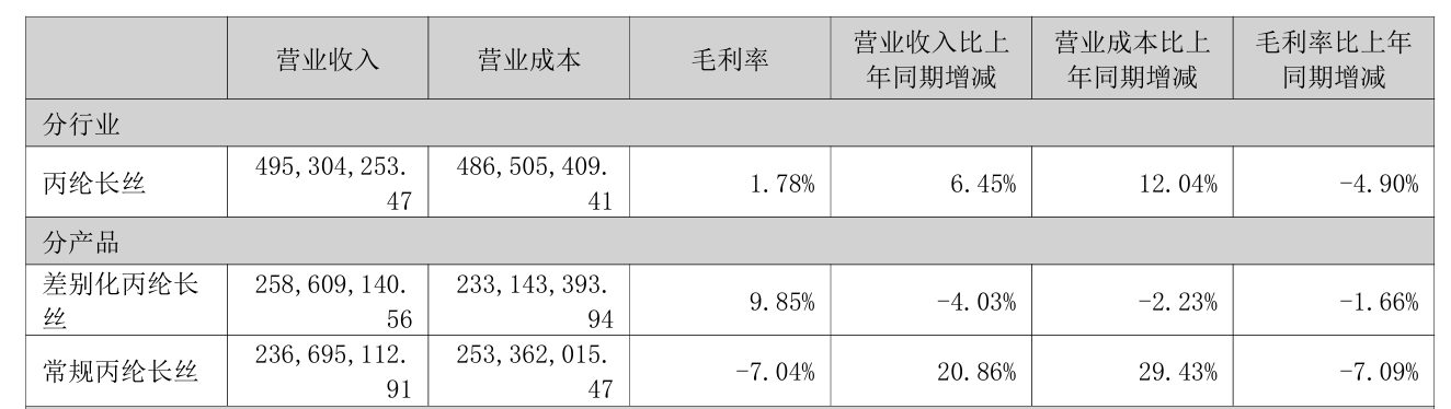 其中,差别化丙纶长丝产品实现收入2.59亿元,同比微降4.03%,毛利率亦下滑1.66%。反观常规丙纶长丝产品,2.37亿元的收入账面上同比增长逾两成,但毛利率出现“断崖式”下跌,由正转负,最终定格在刺眼的-7.04%。