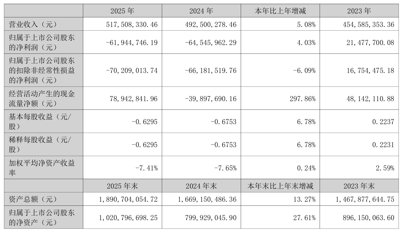 4月2日晚间,蒙泰高新(300876)发布2025年年度报告,公司全年实现营业收入5.18亿元,同比上升5.1%;归母净利润亏损6194.47万元,亏损额同比收窄4.03%,近两年累计亏损1.26亿元;扣非净利润亏损7021万元,亏损额同比扩大。