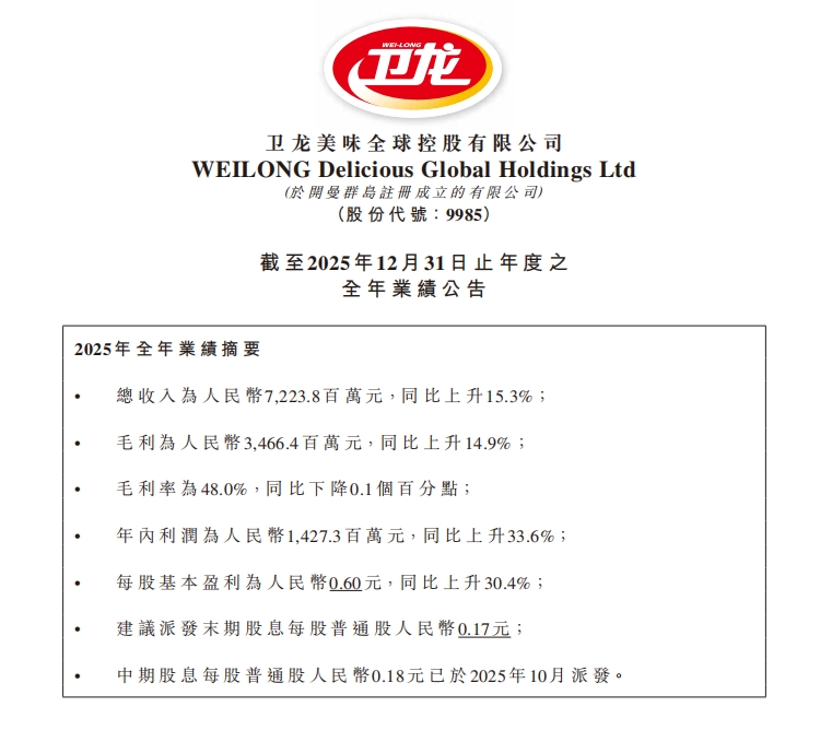 2026年3月26日,卫龙美味(09985.HK)正式发布2025年全年业绩。数据显示,报告期内公司实现总收入72.24亿元,同比增长15.3%;净利润14.27亿元,同比增幅达到33.6%。更值得关注的是产品结构的深层变化:蔬菜制品(以魔芋爽为核心)的营收占比则历史性地突破62.4%。这一变化,揭示了一个关键事实:卫龙正成功地从传统调味面制品企业向多元化的辣味休闲食品龙头转型,增长引擎已顺利完成“换挡”。