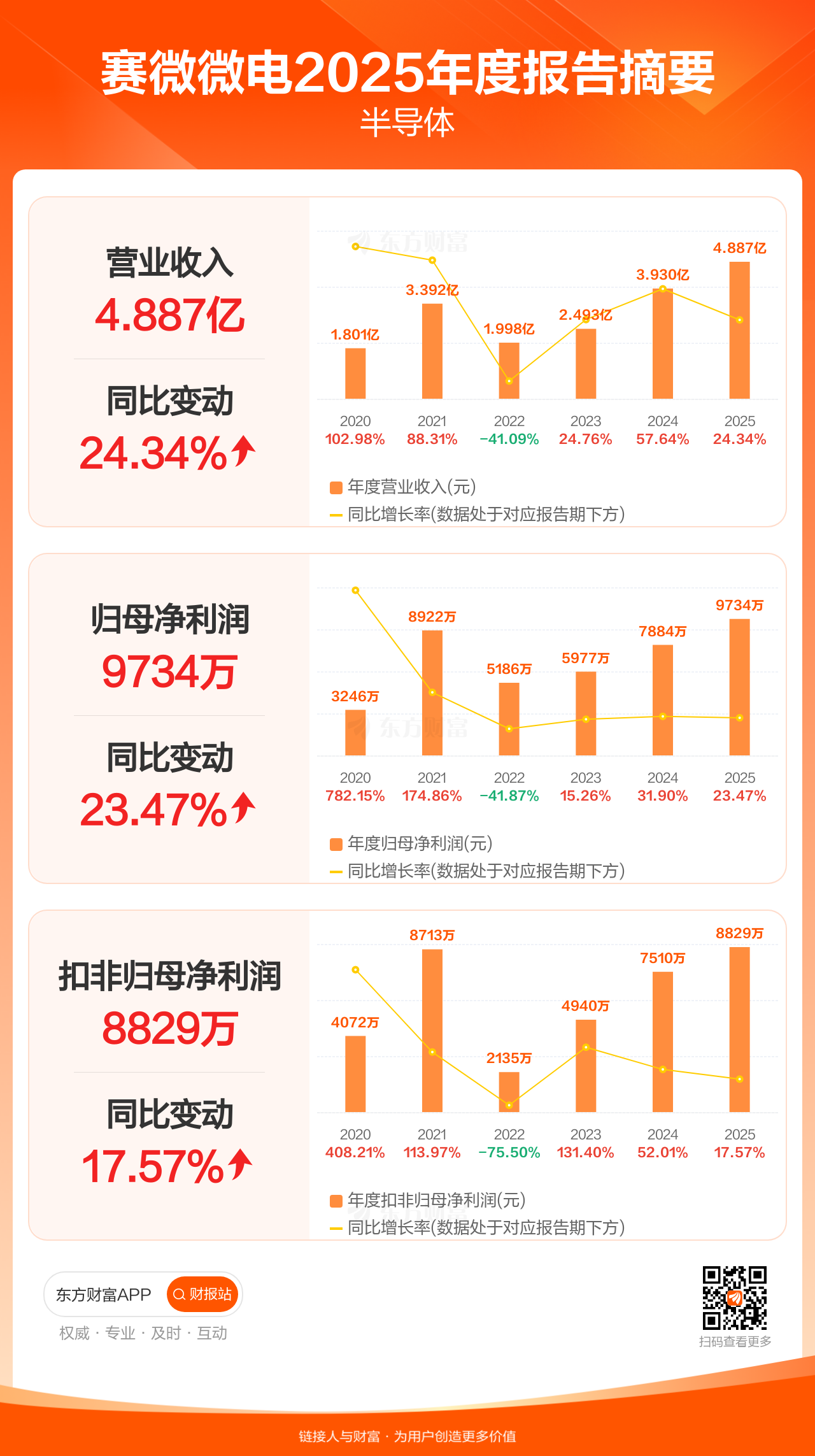 赛微微电4月3日发布2025年年报显示,公司全年实现营业收入4.89亿元,同比增长24.34%;归母净利润9734.49万元,同比增长23.47%;扣非归母净利润8829.45万元,同比增长17.57%。