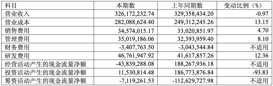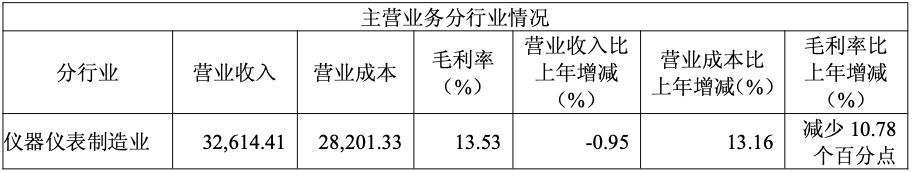 报告期内,公司实现营业收入32,617.22万元,营业成本28,208.86万元,其中主营业务收入32,614.41万元,主营业务成本28,201.33万元。报告期内,公司毛利率同比下降10.78%,主要是受宏观经济下行影响,行业仪器设备需求萎缩,市场竞争加剧导致毛利率下降,以及项目退货等因素影响,导致公司毛利下滑。