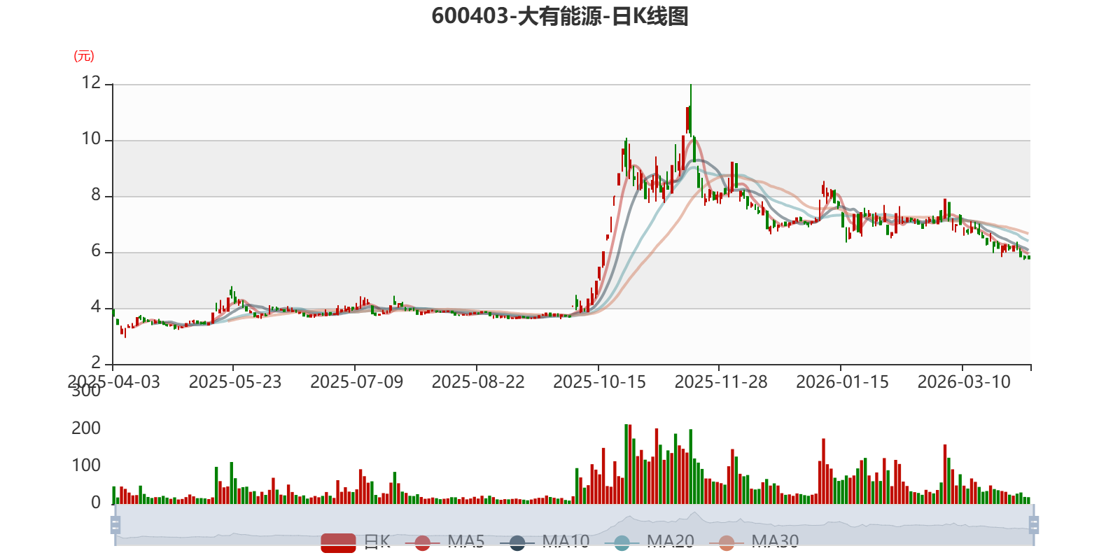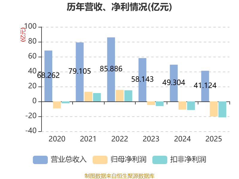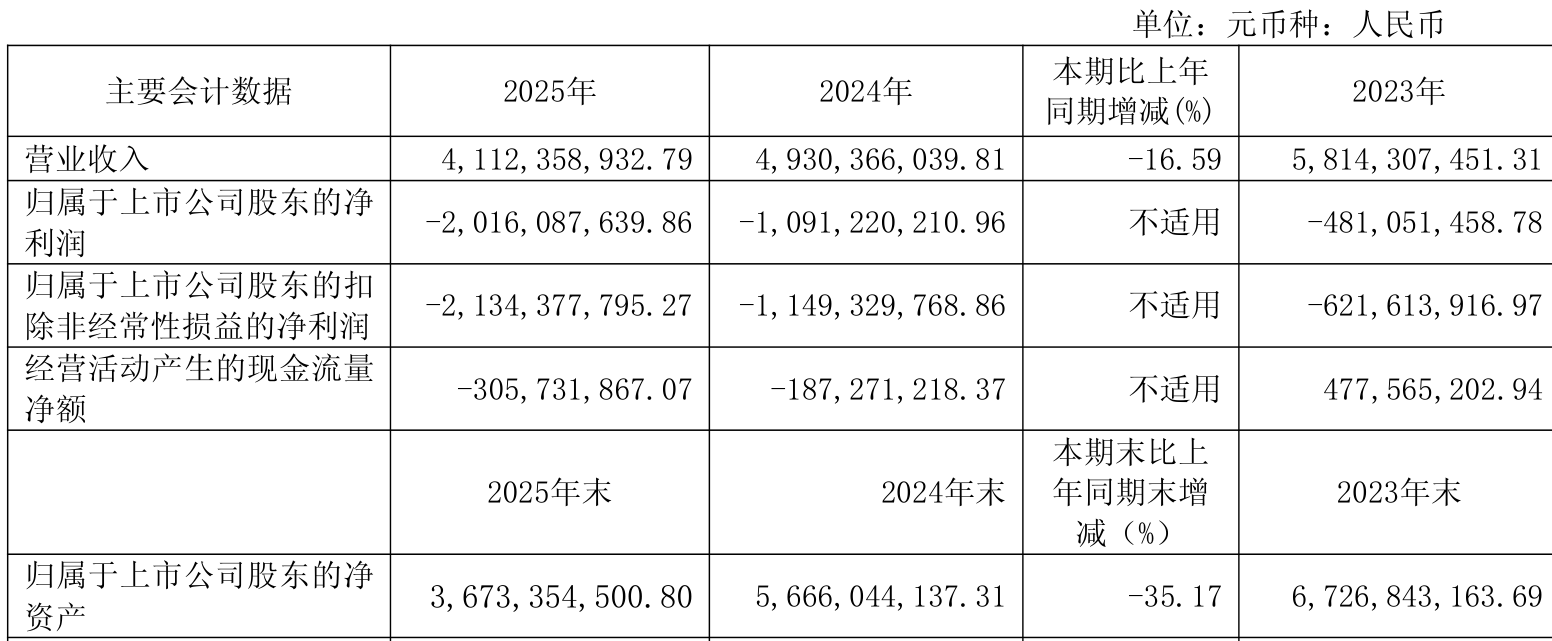 中证智能财讯大有能源(600403)4月3日披露2025年年度报告。2025年,公司实现营业总收入41.12亿元,同比下降16.59%;归母净利润亏损20.16亿元,上年同期亏损10.91亿元;扣非净利润亏损21.34亿元,上年同期亏损11.49亿元;经营活动产生的现金流量净额为-3.06亿元,上年同期为-1.87亿元;报告期内,大有能源基本每股收益为-0.8433元,加权平均净资产收益率为-43.17%。