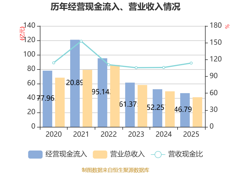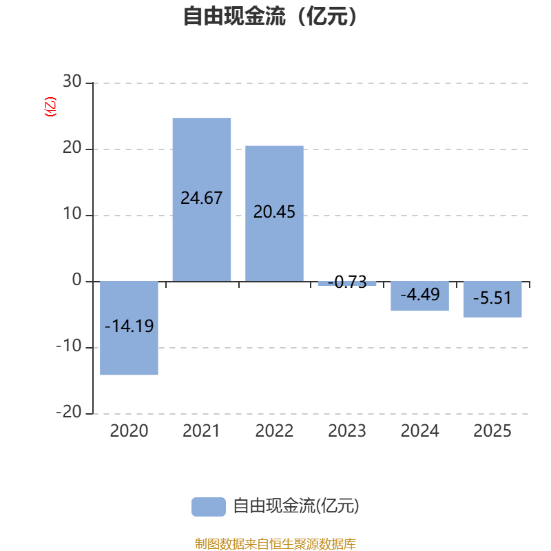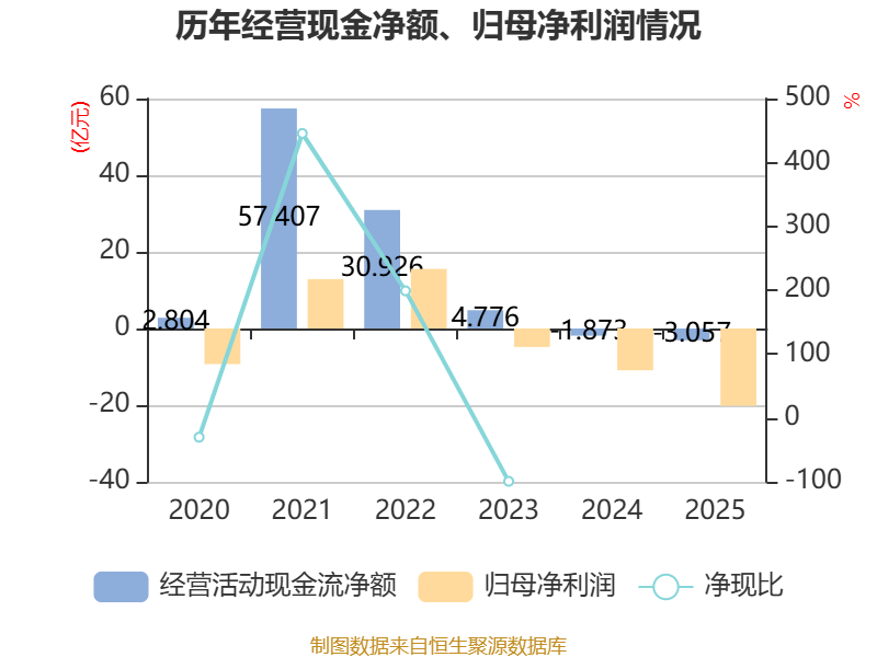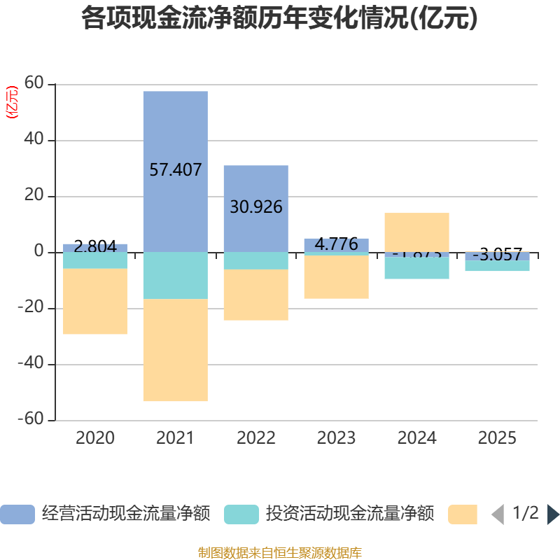 截至2025年,公司经营活动现金流净额为-3.06亿元,同比减少1.18亿元;筹资活动现金流净额2472.16万元,同比减少13.73亿元;投资活动现金流净额-3.71亿元,上年同期为-7.74亿元。