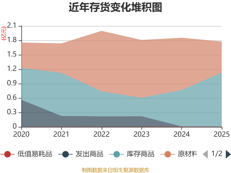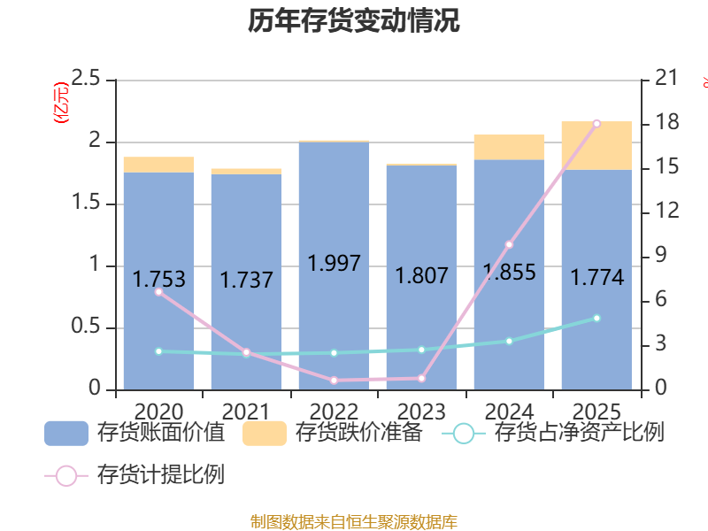 从存货变动来看,截至2025年末,公司存货账面价值为1.77亿元,占净资产的4.83%,较上年末减少806.06万元。其中,存货跌价准备为3898.19万元,计提比例为18.01%。