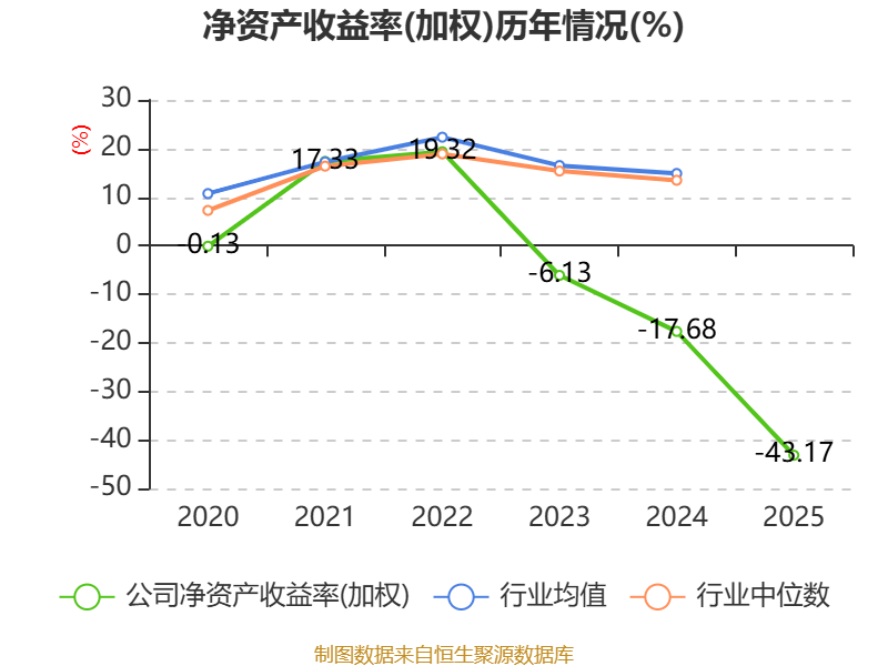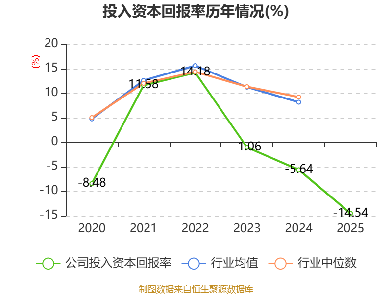 数据显示,2025年公司加权平均净资产收益率为-43.17%,较上年同期下降25.49个百分点。公司2025年投入资本回报率为-14.54%,较上年同期下降8.9个百分点。