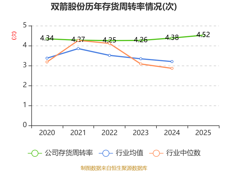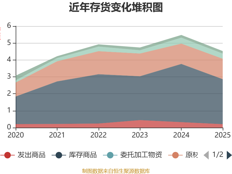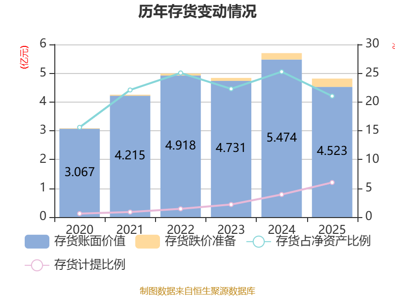 从存货变动来看,截至2025年末,公司存货账面价值为4.52亿元,占净资产的21.02%,较上年末减少9507.63万元。其中,存货跌价准备为2889.76万元,计提比例为6.01%。