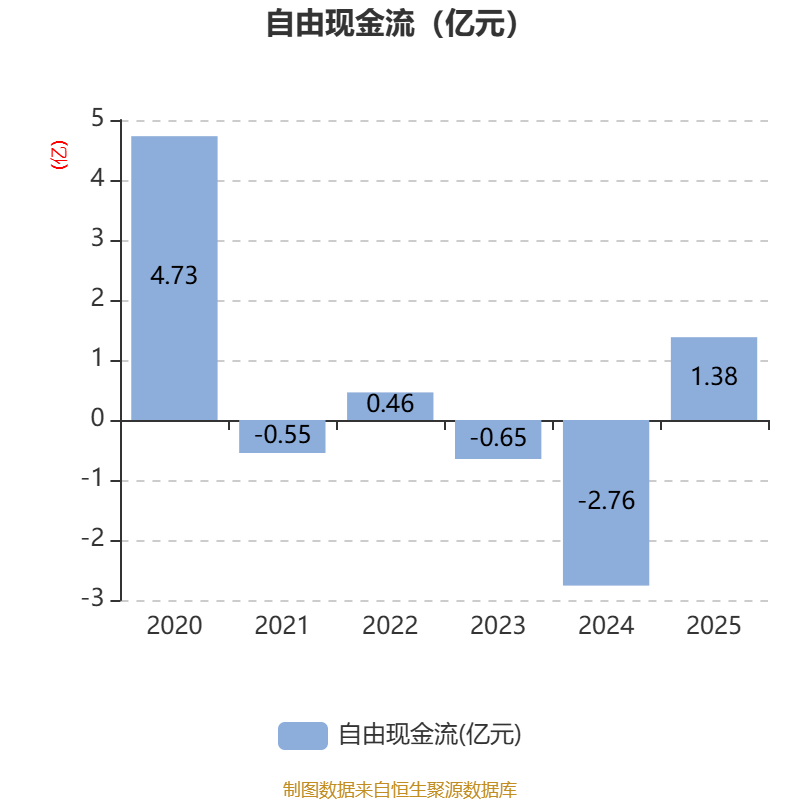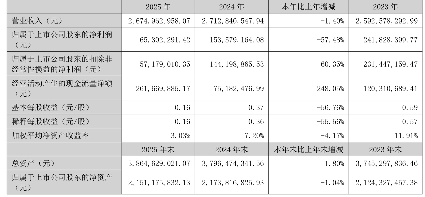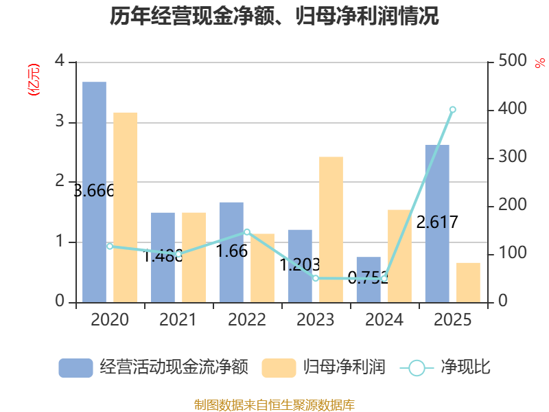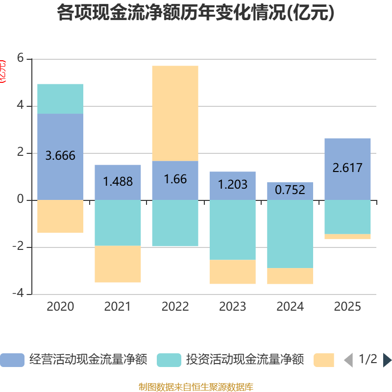 截至2025年,公司经营活动现金流净额为2.62亿元,同比增长248.05%;筹资活动现金流净额-2103.37万元,同比增加4659.74万元;投资活动现金流净额-1.45亿元,上年同期为-2.9亿元。