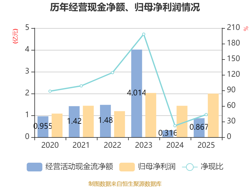 截至2025年,公司经营活动现金流净额为8668.08万元,同比增长174.6%;筹资活动现金流净额-1.59亿元,同比减少4.24亿元;投资活动现金流净额1.93亿元,上年同期为-7.38亿元。