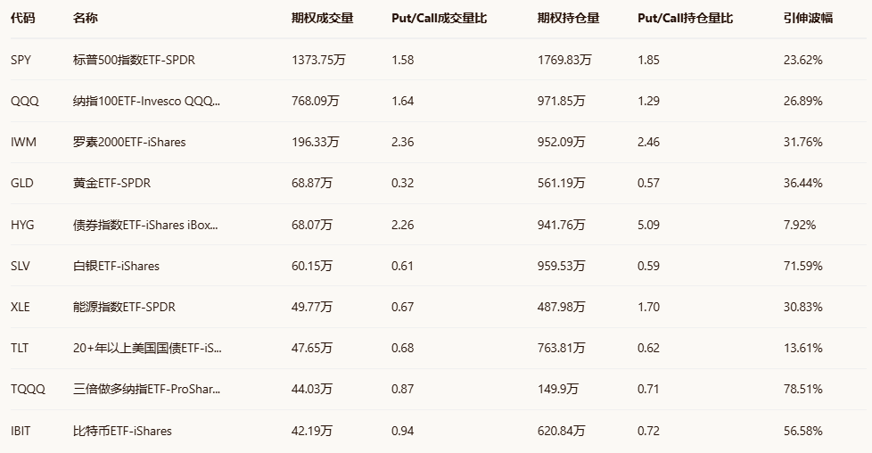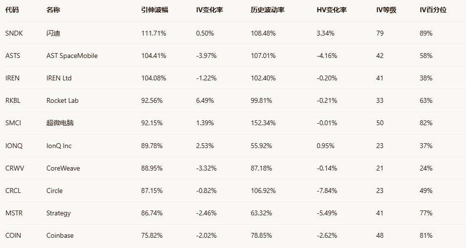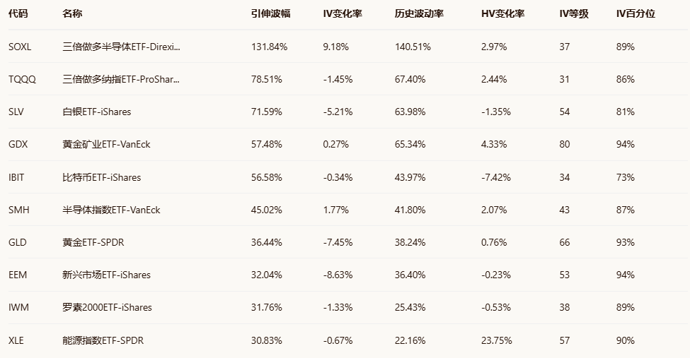 引申波幅排行榜(标的市值>10亿美元,且期权成交量>10万)