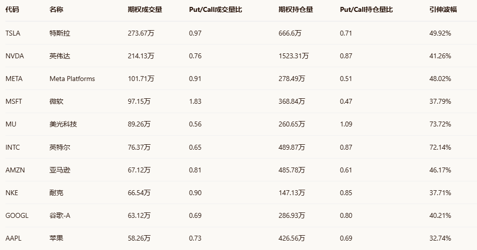 美股期权波动率排行榜前十(标的市值>100亿美元,且期权成交量>10万张)