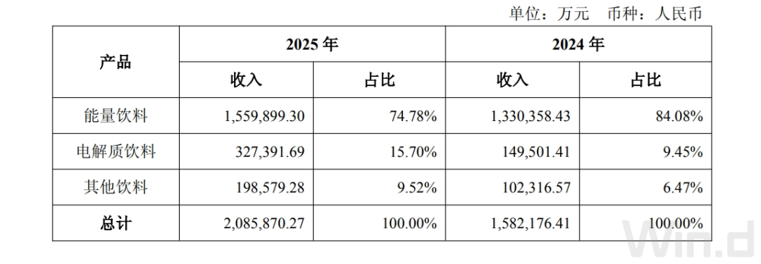 为此,公司早已布局“第二曲线”,其中电解质饮料“东鹏补水啦”表现最为亮眼。2025年,“补水啦”收入达到32.74亿元,同比增速接近120%,营收占比提升至15.7%。此外,“东鹏大咖”、“果之茶”等新品也在快速增长。