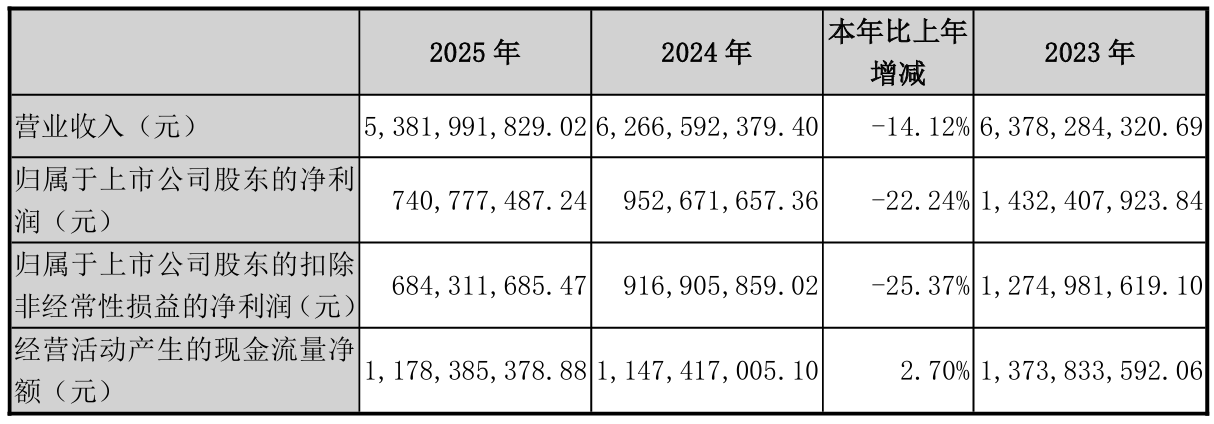 4月2日晚间,伟星新材(002372)发布2025年年度报告,公司全年实现营业收入53.82亿元,同比下降14.12%;归母净利润为7.41亿元,同比下降22.24%;扣非净利润为6.84亿元,同比下降25.37%。