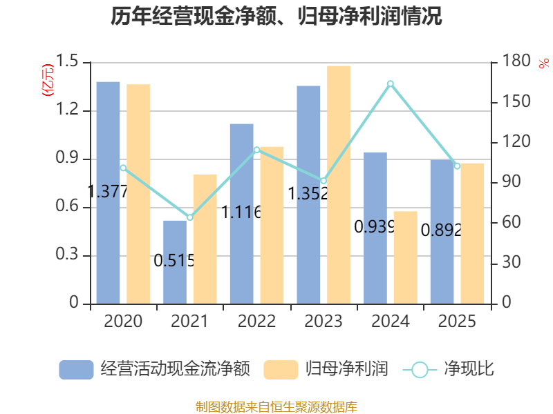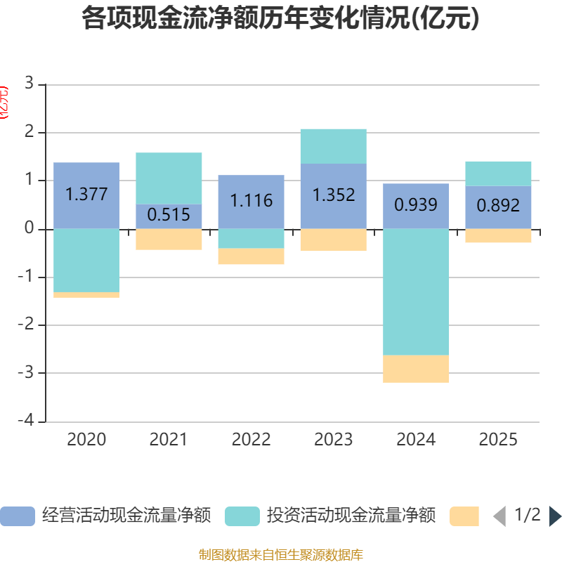 截至2025年,公司经营活动现金流净额为8924.97万元,同比下降4.92%;筹资活动现金流净额-2849.85万元,同比增加2836.16万元;投资活动现金流净额5047.07万元,上年同期为-2.63亿元。