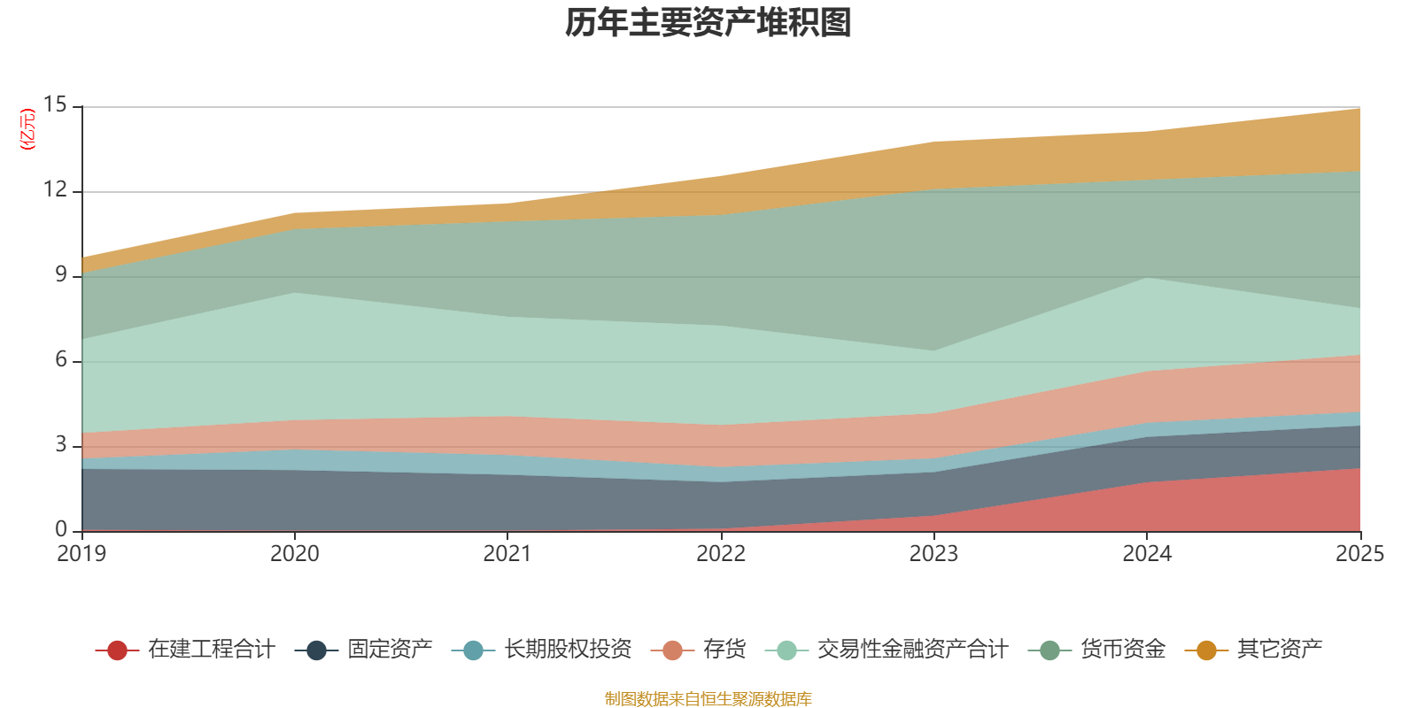 资产重大变化方面,截至2025年末,公司交易性金融资产合计较上年末减少50.05%,占公司总资产比重下降12.37个百分点;货币资金较上年末增加40.15%,占公司总资产比重上升7.95个百分点;在建工程合计较上年末增加28.78%,占公司总资产比重上升2.65个百分点;一年内到期的非流动资产占公司总资产的1.41%,上年末为0。