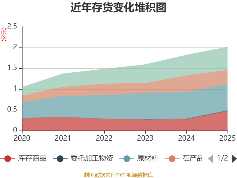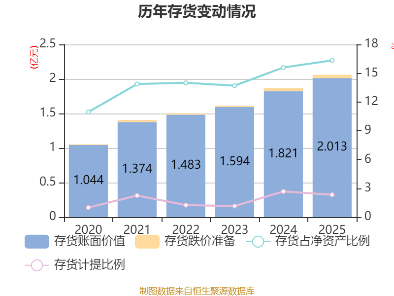 从存货变动来看,截至2025年末,公司存货账面价值为2.01亿元,占净资产的16.33%,较上年末增加1918.21万元。其中,存货跌价准备为481.04万元,计提比例为2.33%。