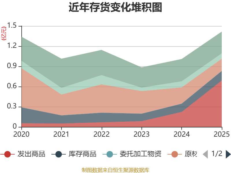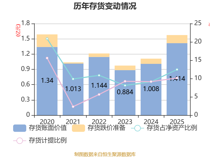 从存货变动来看,截至2025年末,公司存货账面价值为1.41亿元,占净资产的12.45%,较上年末增加4061.85万元。其中,存货跌价准备为1595.1万元,计提比例为10.14%。