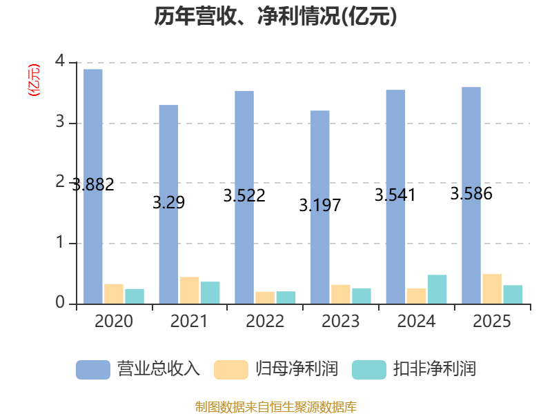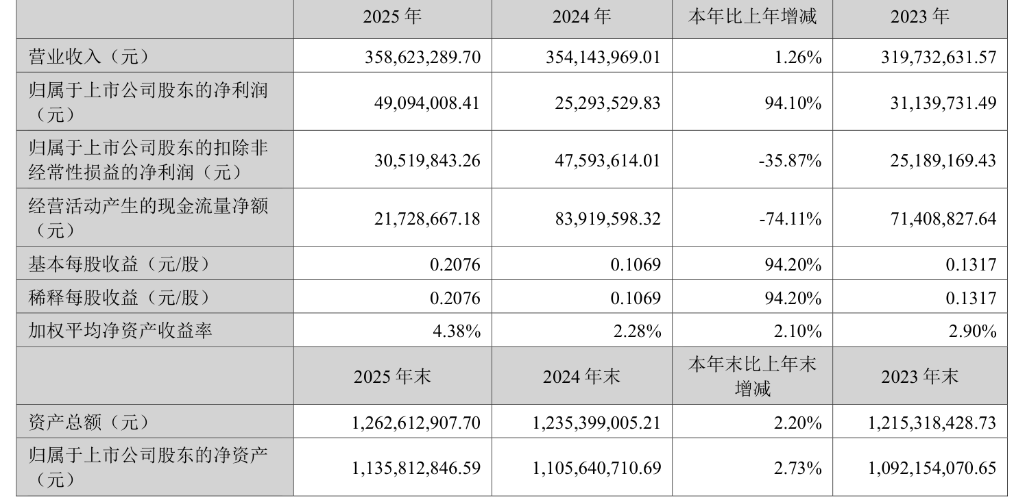 中证智能财讯台基股份(300046)4月3日披露2025年年度报告。2025年,公司实现营业总收入3.59亿元,同比增长1.26%;归母净利润4909.4万元,同比增长94.10%;扣非净利润3051.98万元,同比下降35.87%;经营活动产生的现金流量净额为2172.87万元,同比下降74.11%;报告期内,台基股份基本每股收益为0.2076元,加权平均净资产收益率为4.38%。公司2025年度分配预案为:拟向全体股东每10股派现1.5元(含税)。