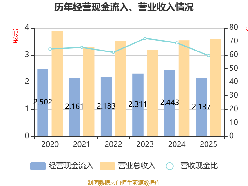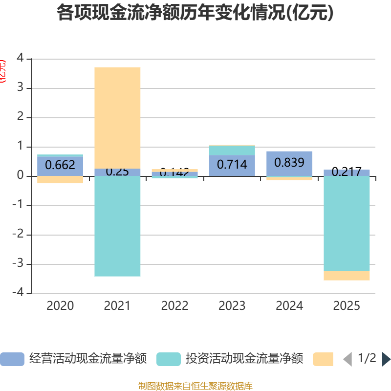 截至2025年,公司经营活动现金流净额为2172.87万元,同比下降74.11%;筹资活动现金流净额-3237.36万元,同比减少2289.78万元;投资活动现金流净额-3.24亿元,上年同期为-433.09万元。