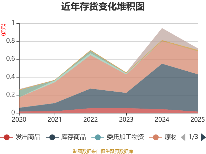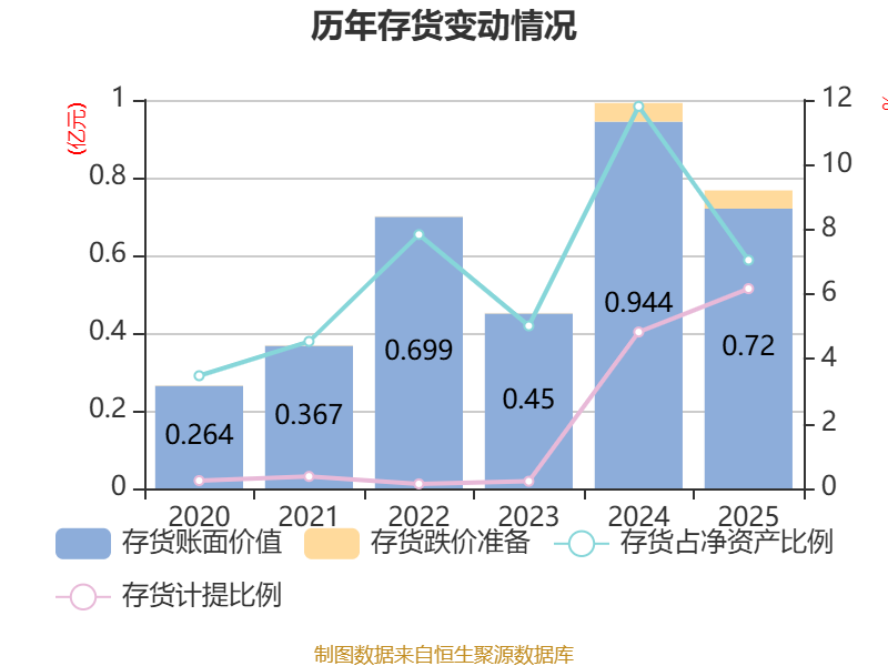 从存货变动来看,截至2025年末,公司存货账面价值为7195.28万元,占净资产的7.05%,较上年末减少2246.51万元。其中,存货跌价准备为472.93万元,计提比例为6.17%。