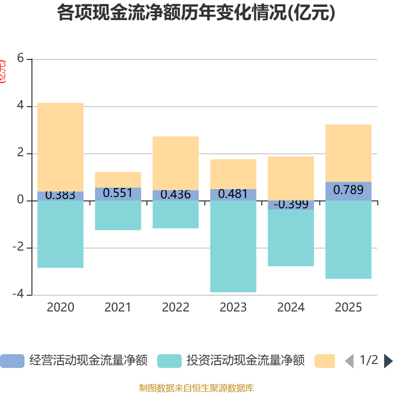 截至2025年,公司经营活动现金流净额为7894.28万元,同比增加1.19亿元;筹资活动现金流净额2.43亿元,同比增加5669.7万元;投资活动现金流净额-3.33亿元,上年同期为-2.39亿元。