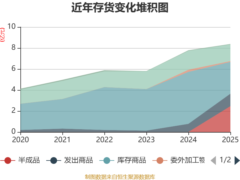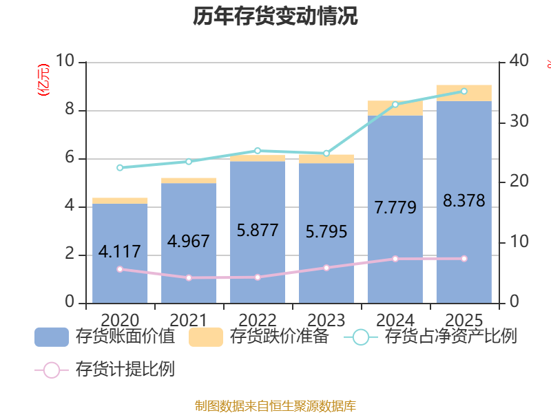 从存货变动来看,截至2025年末,公司存货账面价值为8.38亿元,占净资产的35.14%,较上年末增加5987.79万元。其中,存货跌价准备为6649.98万元,计提比例为7.35%。