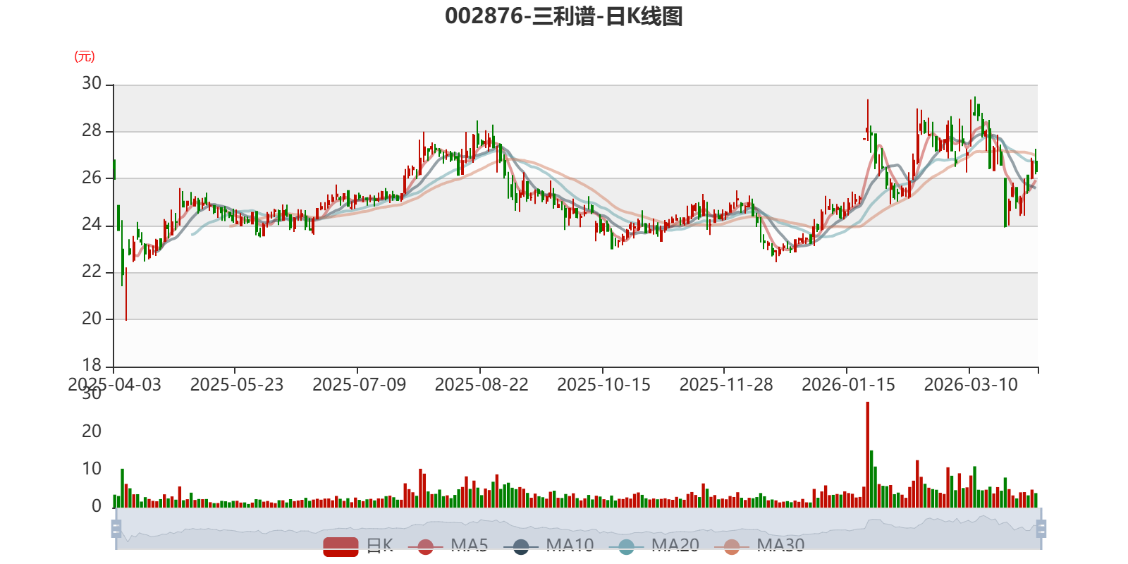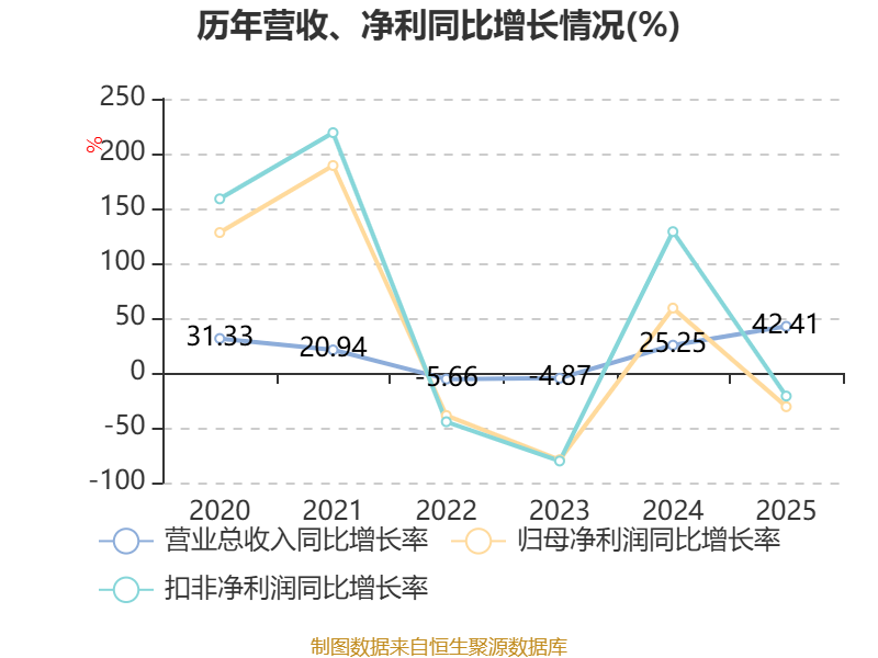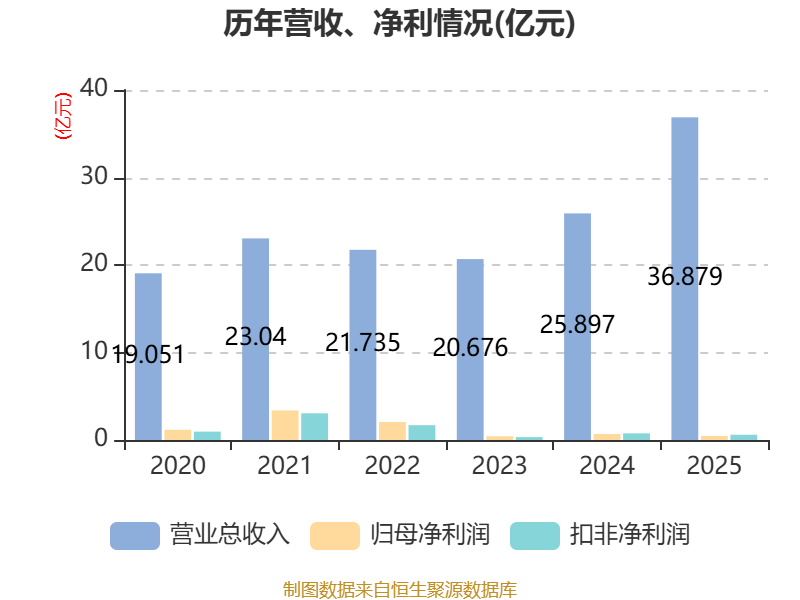 中证智能财讯三利谱(002876)4月3日披露2025年年度报告。2025年,公司实现营业总收入36.88亿元,同比增长42.41%;归母净利润4708.69万元,同比下降30.85%;扣非净利润5985.99万元,同比下降21.15%;经营活动产生的现金流量净额为1.93亿元,同比增长357.45%;报告期内,三利谱基本每股收益为0.27元,加权平均净资产收益率为1.99%。公司2025年度分配预案为:拟向全体股东每10股派现1.09元(含税)。