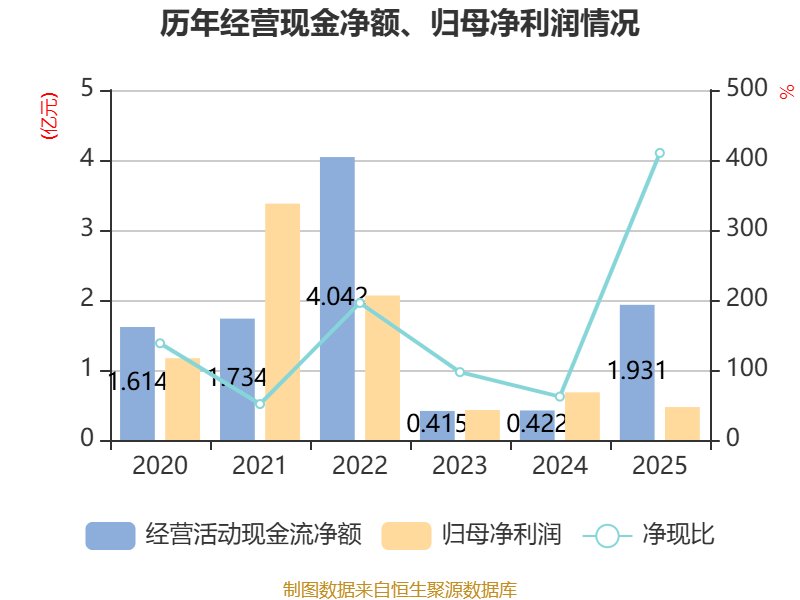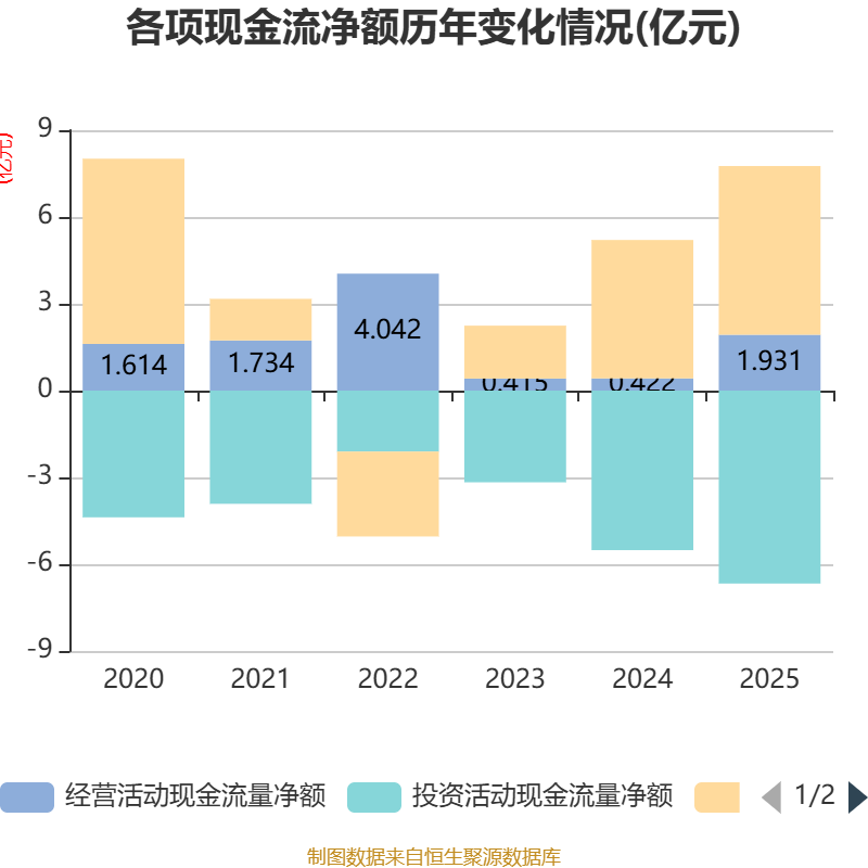 截至2025年,公司经营活动现金流净额为1.93亿元,同比增长357.45%;筹资活动现金流净额5.83亿元,同比增加1.05亿元;投资活动现金流净额-6.67亿元,上年同期为-5.51亿元。