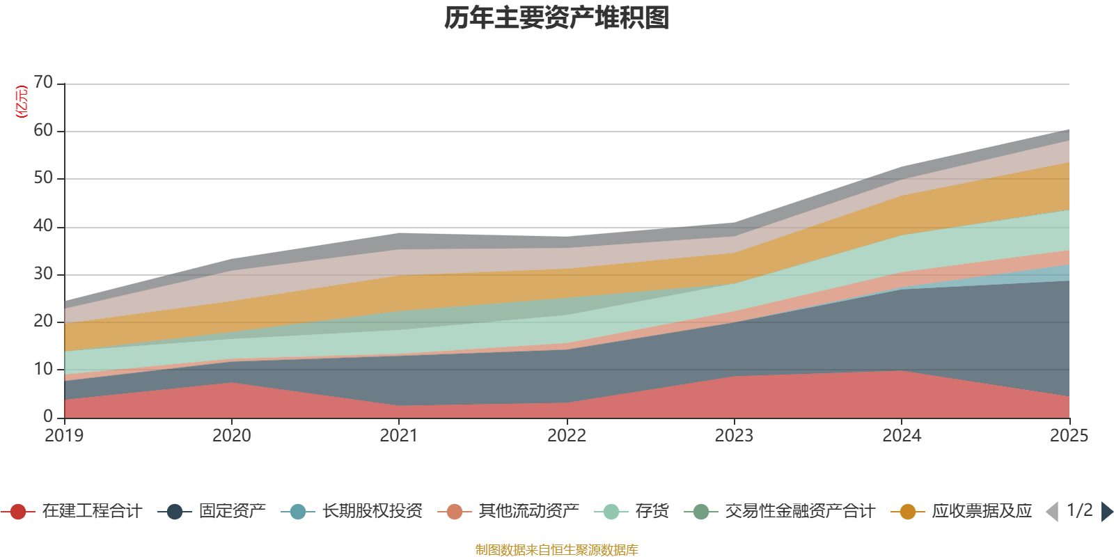 资产重大变化方面,截至2025年末,公司在建工程合计较上年末减少54.67%,占公司总资产比重下降11.35个百分点;固定资产较上年末增加42.37%,占公司总资产比重上升7.72个百分点;长期股权投资较上年末增加604.85%,占公司总资产比重上升4.71个百分点;货币资金较上年末增加35.6%,占公司总资产比重上升1.15个百分点。