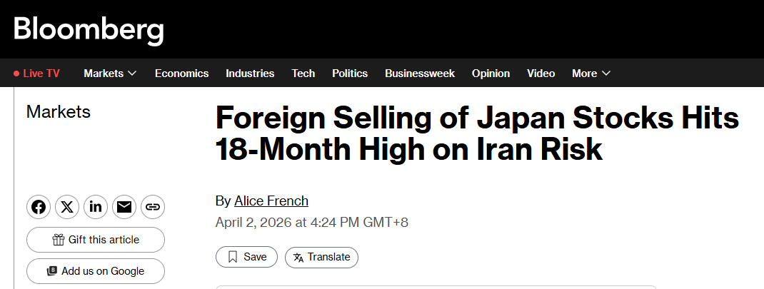 中新经纬4月2日电据彭博社2日报道,上周,外国投资者抛售日本股票的数量创下自2024年9月以来的最高水平,这再次表明市场日益担忧美以伊局势对亚洲经济的影响。