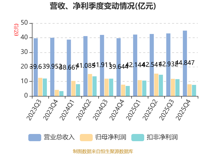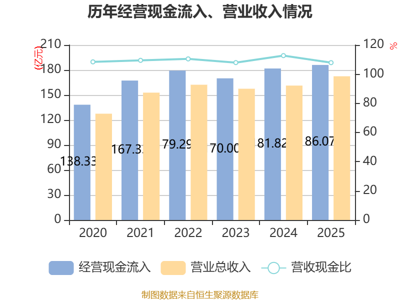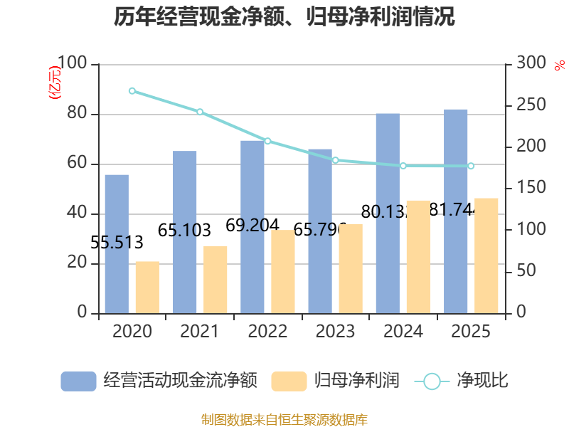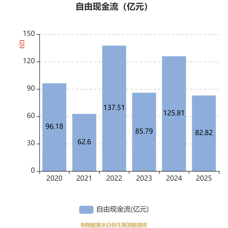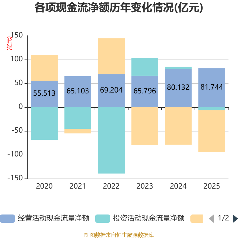 截至2025年,公司经营活动现金流净额为81.74亿元,同比增长2.01%;筹资活动现金流净额-87.72亿元,同比减少8.66亿元;投资活动现金流净额-6.68亿元,上年同期为4.78亿元。