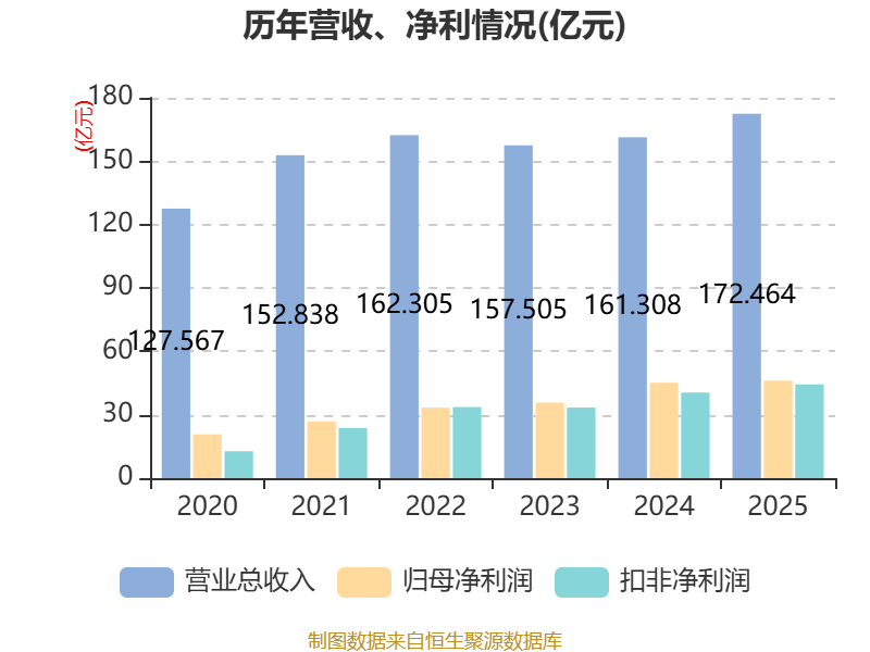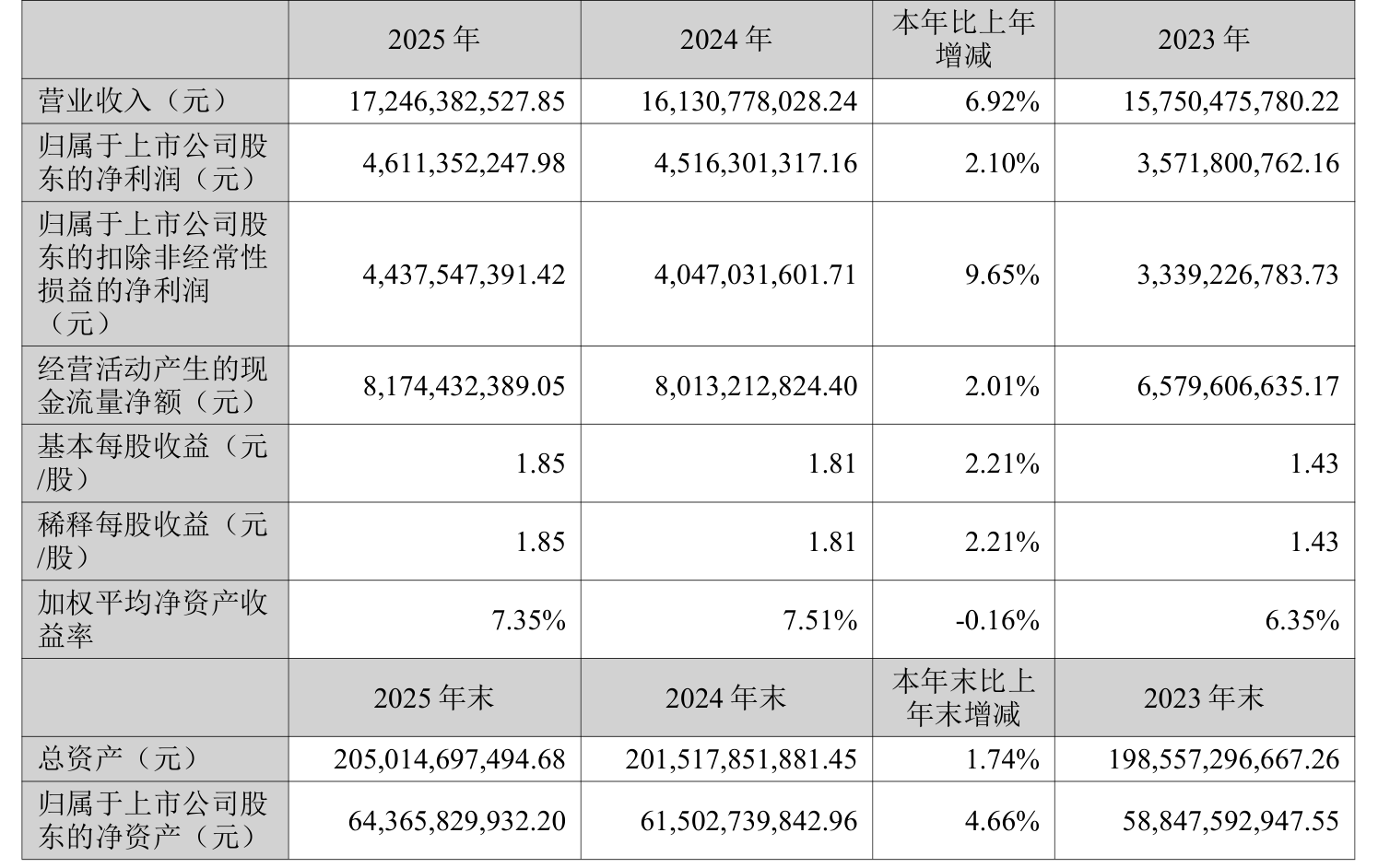 中证智能财讯招商港口(001872)4月3日披露2025年年度报告。2025年,公司实现营业总收入172.46亿元,同比增长6.92%;归母净利润46.11亿元,同比增长2.10%;扣非净利润44.38亿元,同比增长9.65%;经营活动产生的现金流量净额为81.74亿元,同比增长2.01%;报告期内,招商港口基本每股收益为1.854元,加权平均净资产收益率为7.35%。公司2025年度分配预案为:拟向全体股东每10股派现7.99元(含税)。