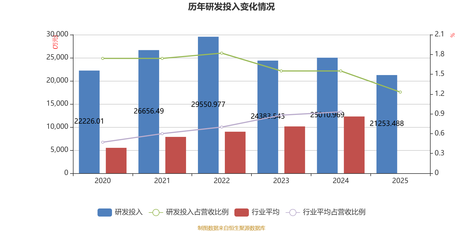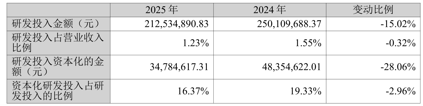 2025年全年,公司研发投入金额为2.13亿元,同比下降15.02%;研发投入占营业收入比例为1.23%,相比上年同期下降0.32个百分点。此外,公司全年研发投入资本化率为16.37%。