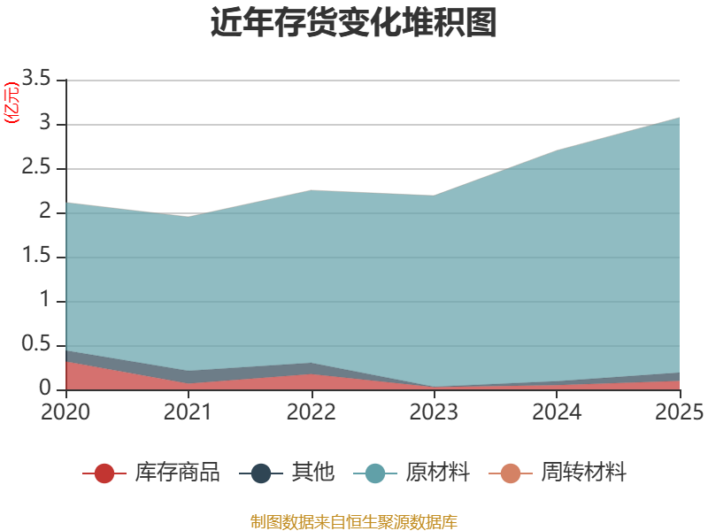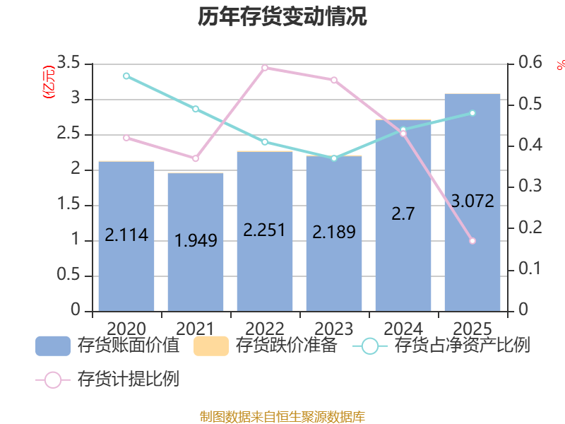 从存货变动来看,截至2025年末,公司存货账面价值为3.07亿元,占净资产的0.48%,较上年末增加3725.84万元。其中,存货跌价准备为52.46万元,计提比例为0.17%。