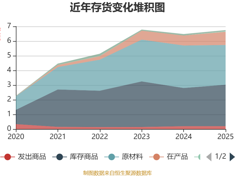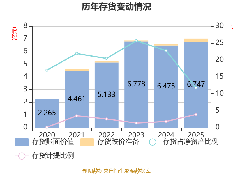 从存货变动来看,截至2025年末,公司存货账面价值为6.75亿元,占净资产的11.74%,较上年末增加2717.39万元。其中,存货跌价准备为2725.99万元,计提比例为3.88%。