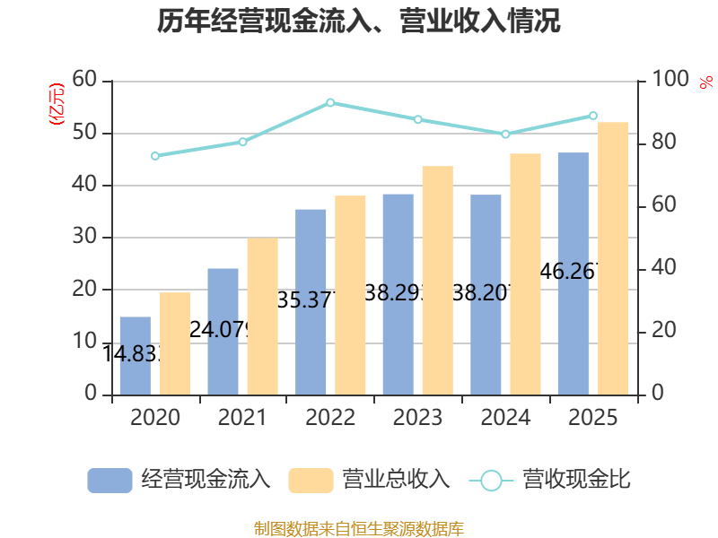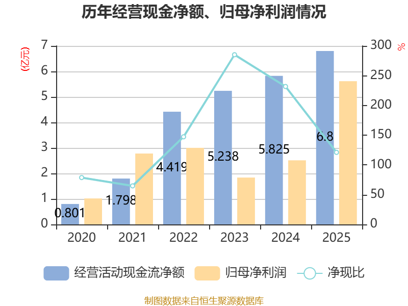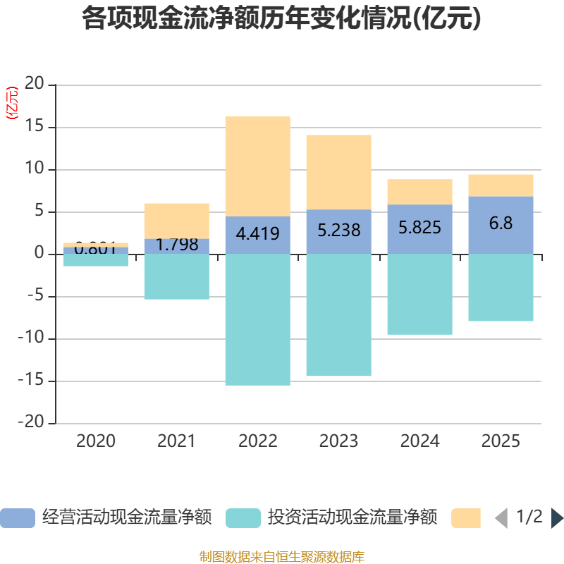 截至2025年,公司经营活动现金流净额为6.8亿元,同比增长16.73%;筹资活动现金流净额2.56亿元,同比减少4269.6万元;投资活动现金流净额-7.95亿元,上年同期为-9.56亿元。