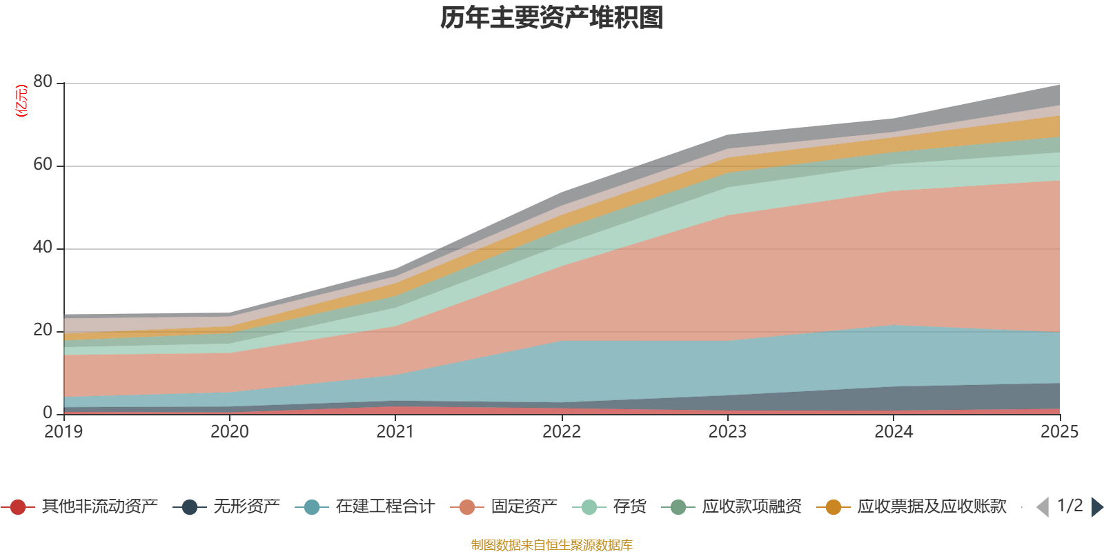 资产重大变化方面,截至2025年末,公司在建工程合计较上年末减少17.48%,占公司总资产比重下降5.41个百分点;应收票据及应收账款较上年末增加43.28%,占公司总资产比重上升1.43个百分点;交易性金融资产合计占公司总资产的1.32%,上年末为0;货币资金较上年末增加88.83%,占公司总资产比重上升1.29个百分点。